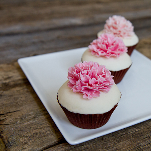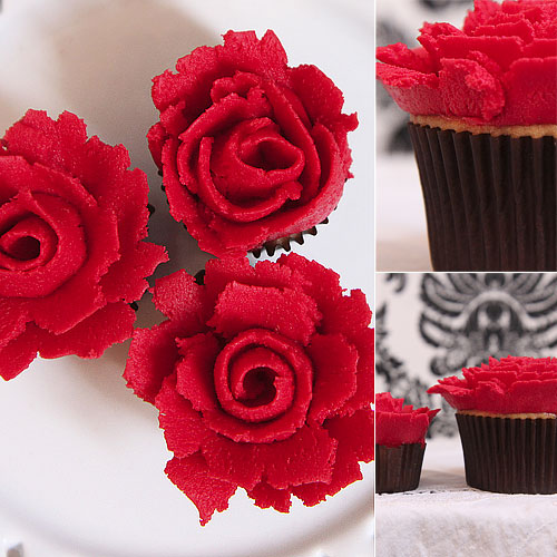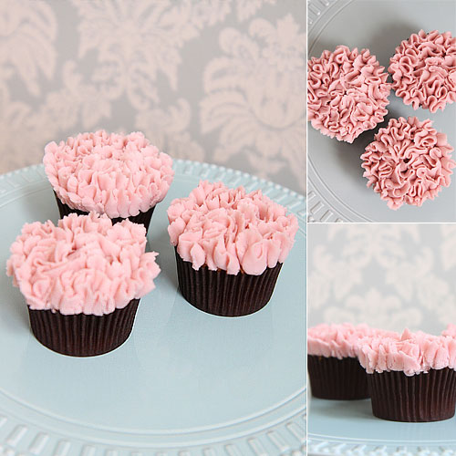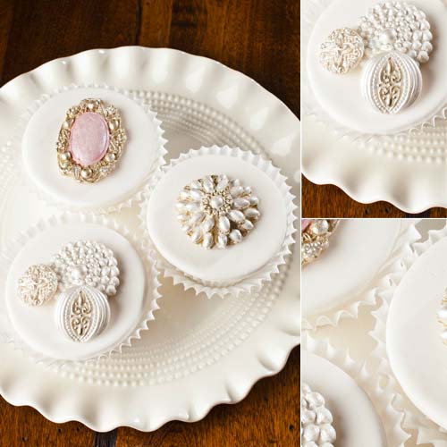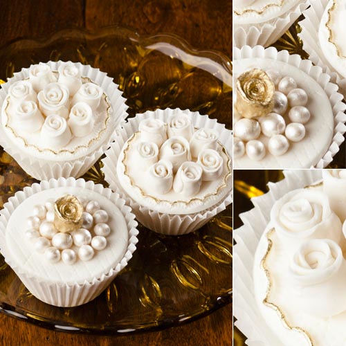 Fondant covered cupcakes with small gumpaste roses and pearls.