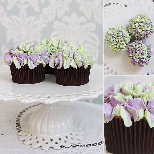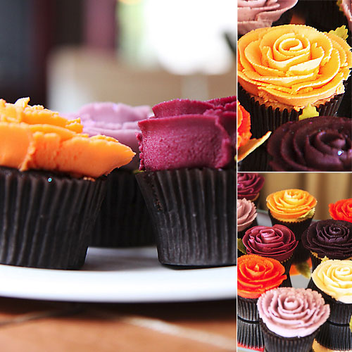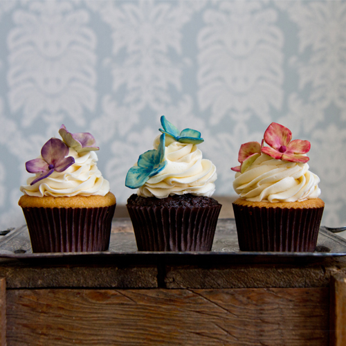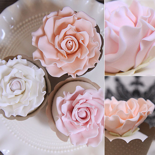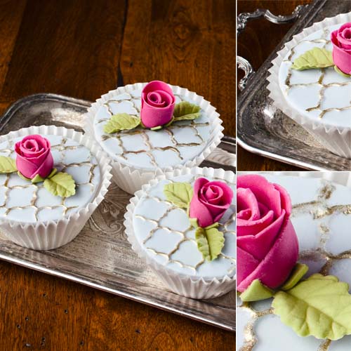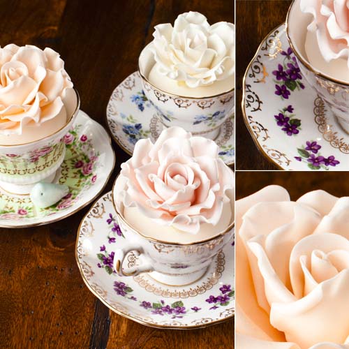 Fondant covered cupcakes with gumpaste roses in vintage china