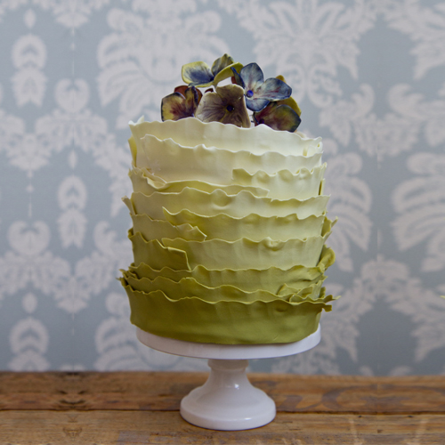 Ombre ruffles with hydrangea 4” mini cake.