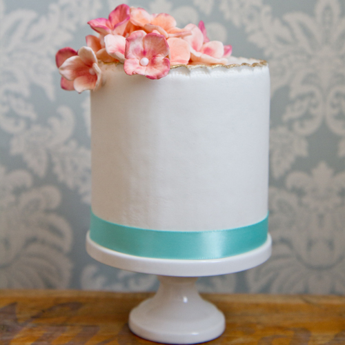 Simply styled 4” mini cake with hydrangea.
