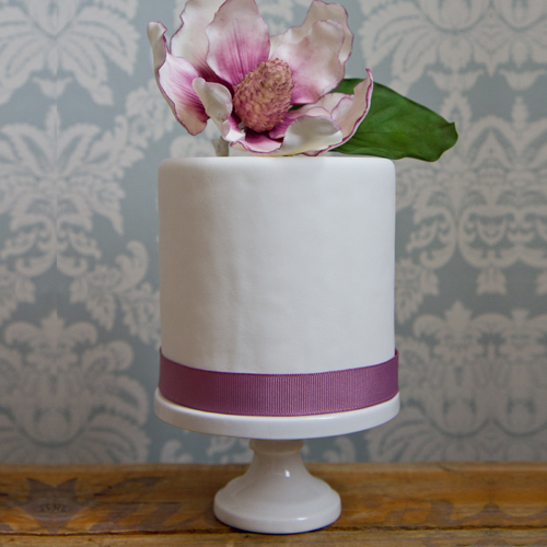 Simply styled 4”mini cake with sugar magnolia.